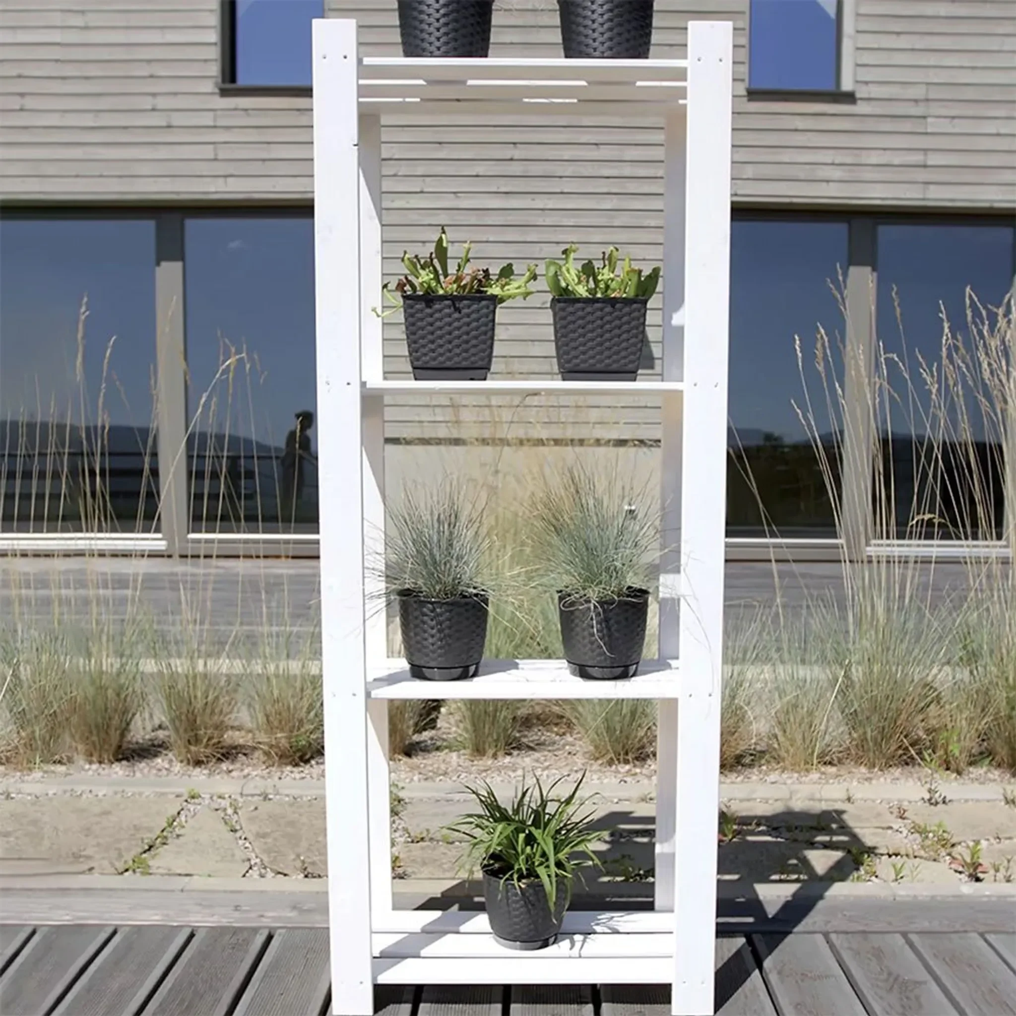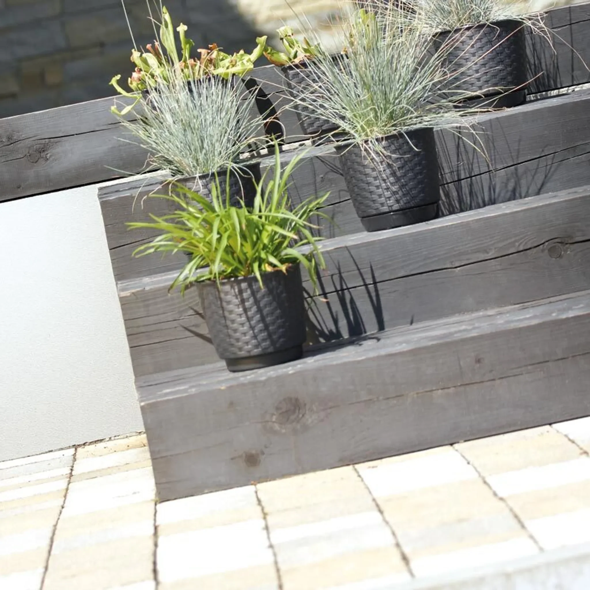 Durch UV- und Witterungsbeständigkeit eignet sich der Topf für den ganzjährigen Einsatz drinnen und draußen. Das geringe Gewicht erleichtert das Umstellen, während der passende Untersetzer sauberes Gießen und Oberflächenschutz ermöglicht.