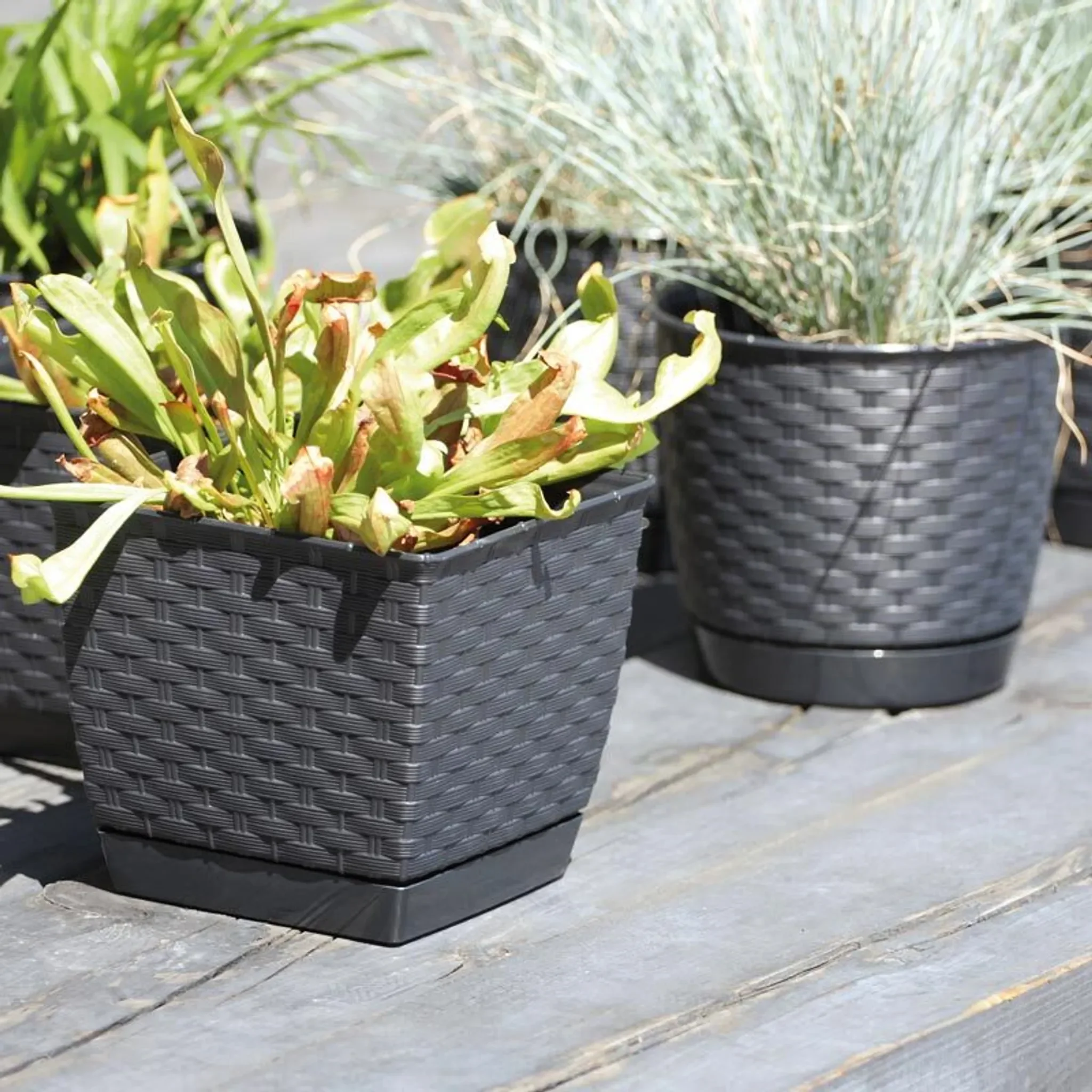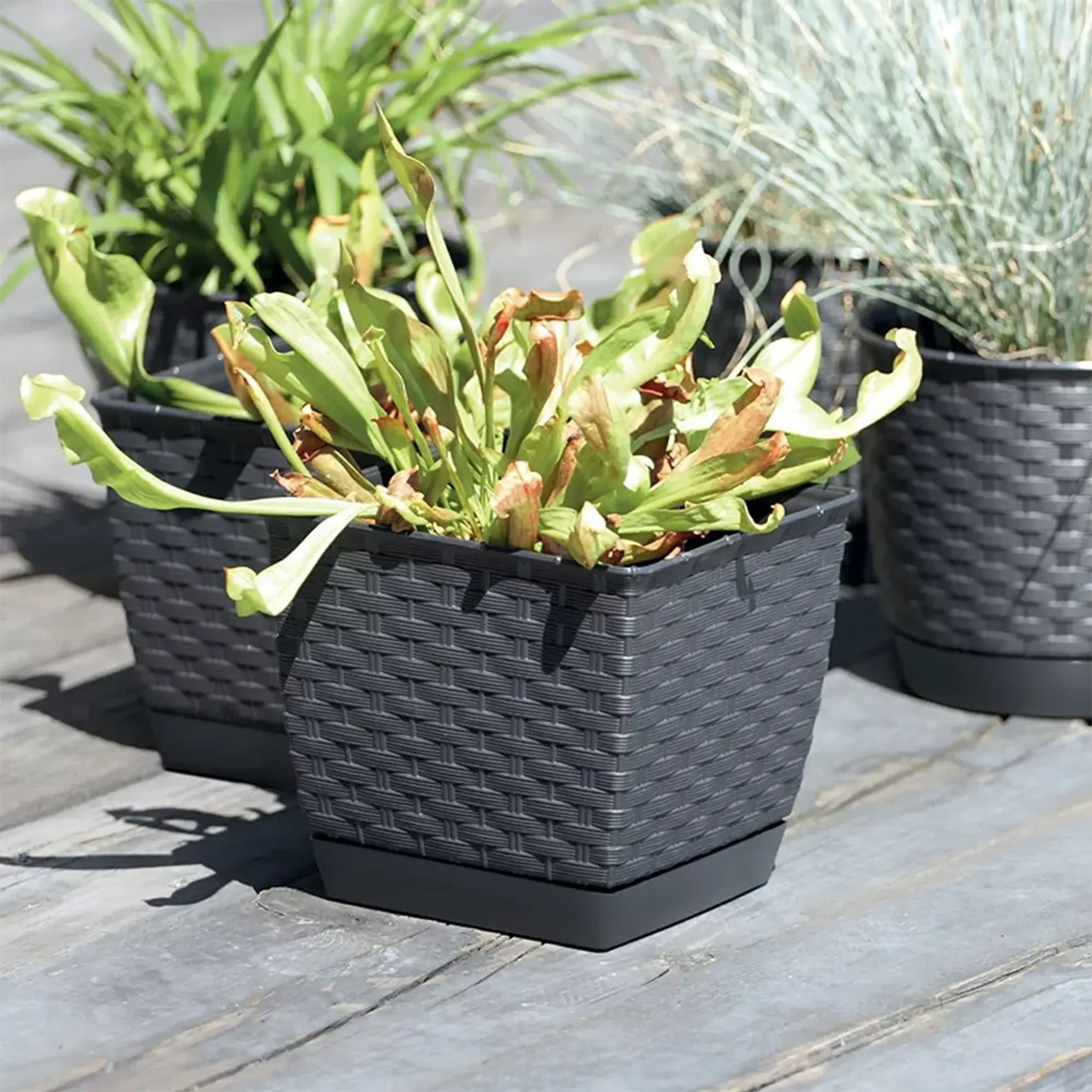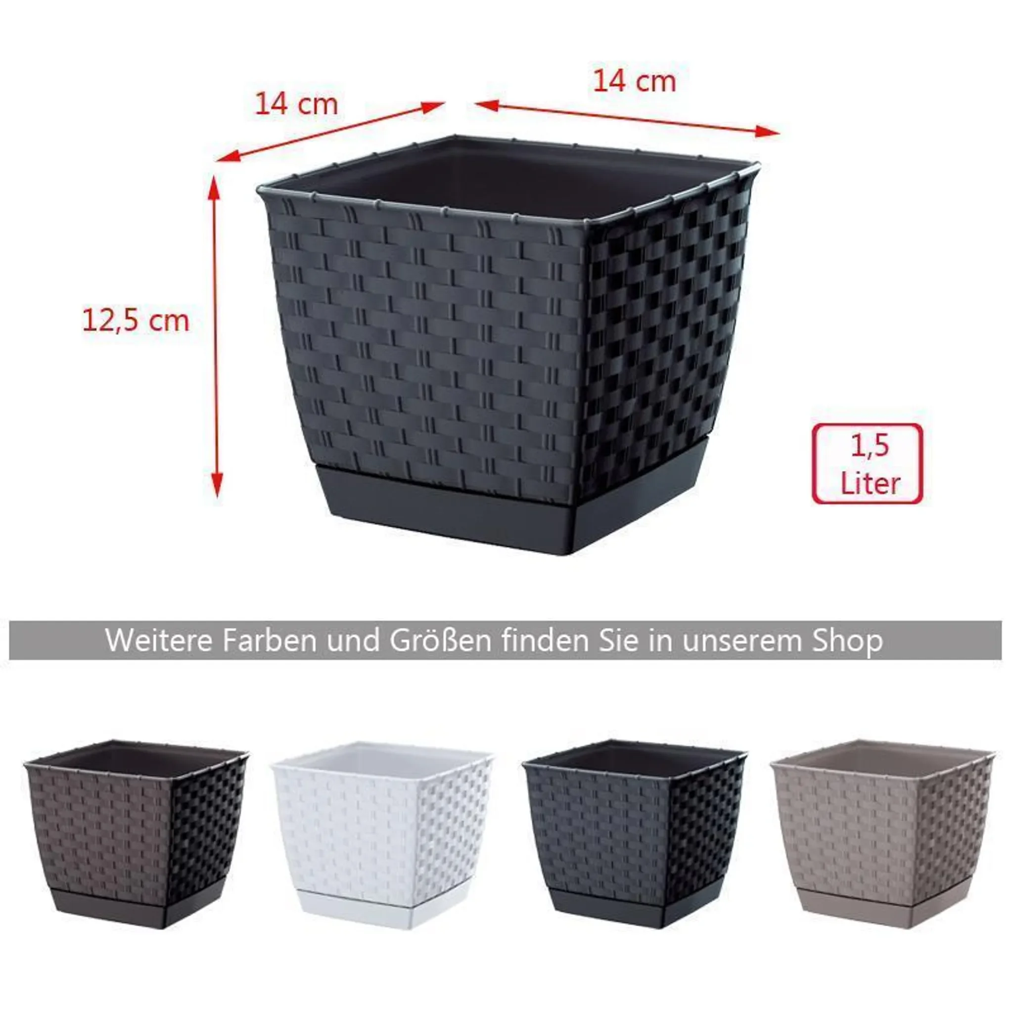 Highlights: Stilvolle Rattan-Optik, leichter & robuster Kunststoff, inklusive Untersetzer, ideal für Kräuter & Zimmerpflanzen, platzsparendes Quadratdesign.