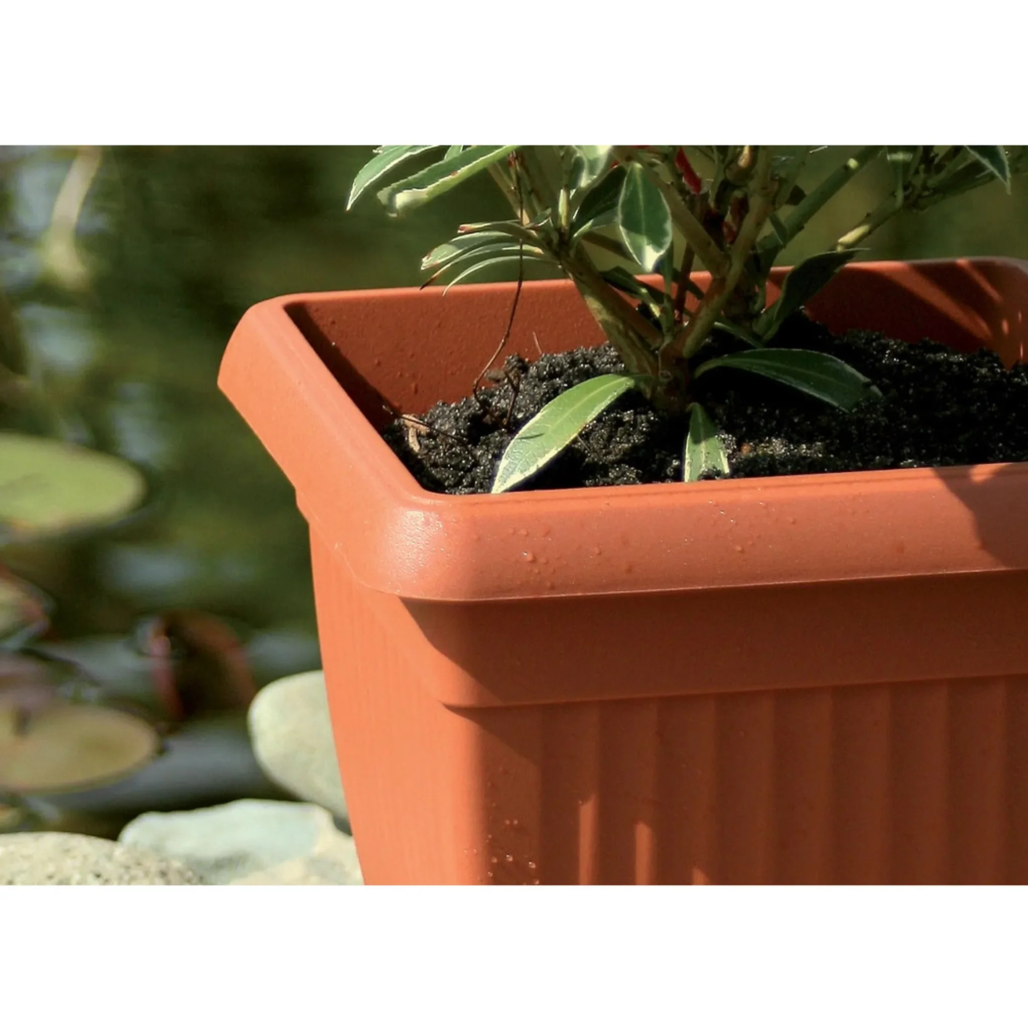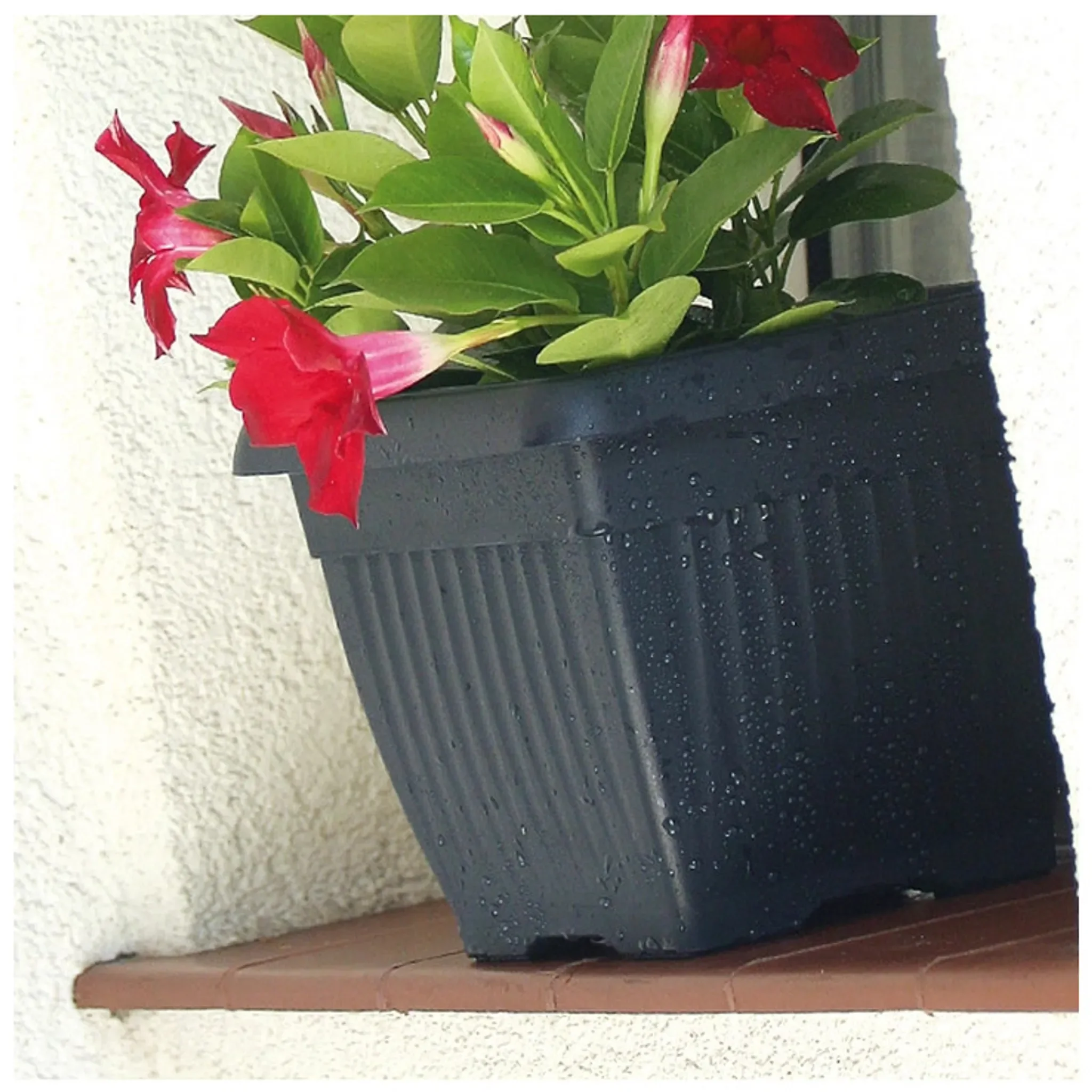 Das robuste Kunststoffmaterial ist schlagfest, wetterfest, UV-beständig und frostsicher, wodurch der Untersetzer ganzjährig eingesetzt werden kann. Seine quadratische Form passt perfekt zu modernen Pflanzgefäßen und sorgt für eine harmonische Optik.