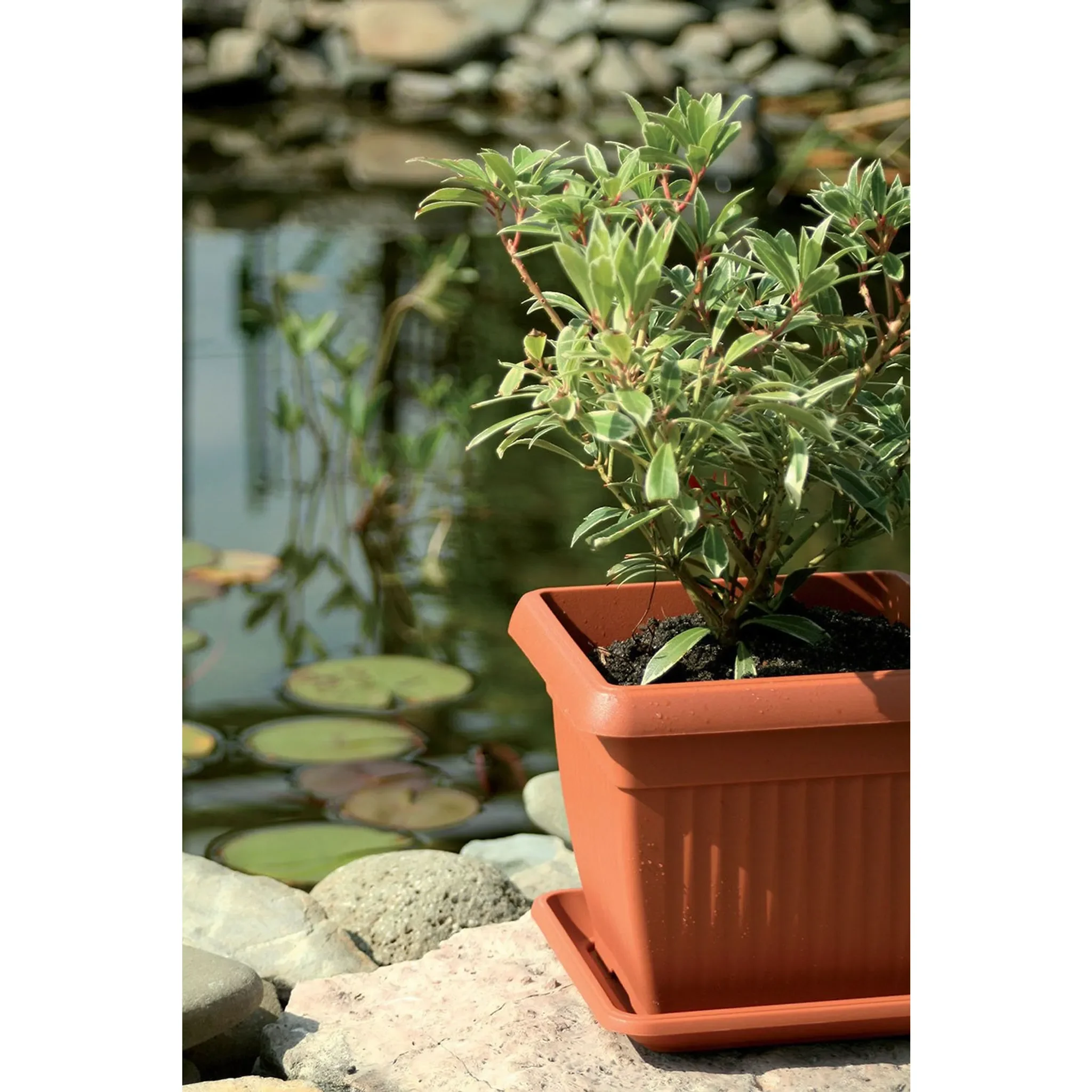 Der quadratische Untersetzer von botle in klassischem Terrakotta schützt Oberflächen zuverlässig vor Feuchtigkeit und bietet eine saubere Wasserableitung. Ideal für Balkon, Terrasse, Garten oder den Wohnbereich.